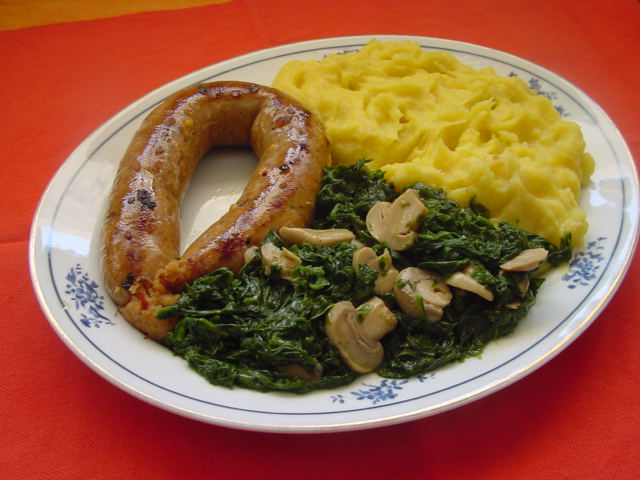 Numa travessa dispuz o puré, a alheira e o salteado de espinafres e cogumelos.